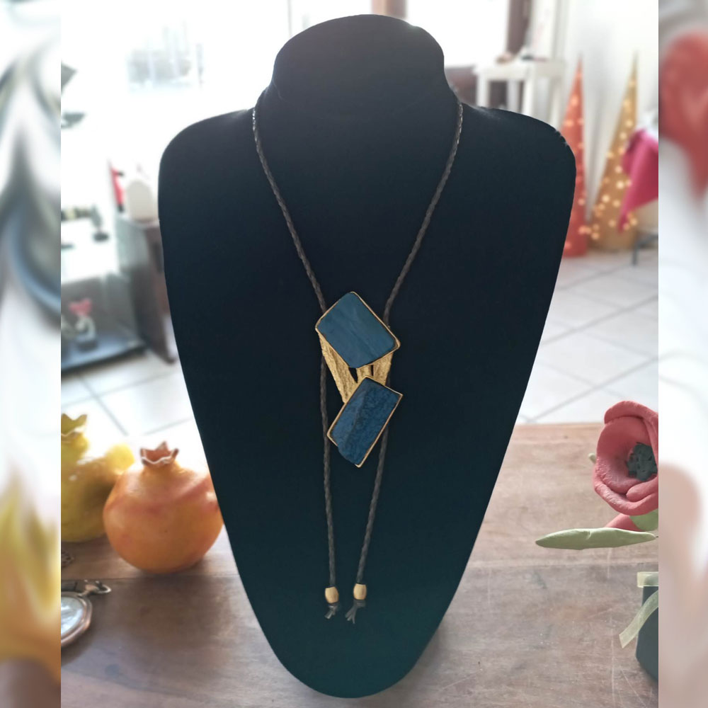 Brass necklace inspired by nature with two impressive blue stones and high quality cord.