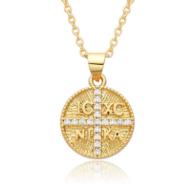 Add a touch of elegance and meaning to your jewelry collection with this exquisite gold-plated copper pendant. Featuring the "IC XC NIKA" inscription ("Jesus Christ Conquers") arranged in a cross design, this pendant beautifully symbolizes faith and victory.